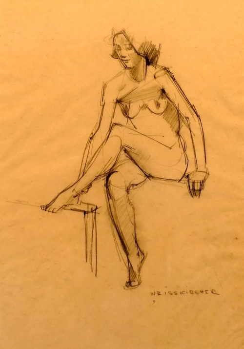"Wie die meisten seiner Landsleute der alten umd mittleren Generation, ist auch Dr. Erwin Weißkircher der Natur zutiefst verbunden. Er blieb ihr treu, auch wenn seine Entwicklung zur Abstraktion (nicht Gegenstandslosigkeit) fortschreitet. Da sind die schwungvollen Kreidezeichnungen in expressiven, samtartigen Linien: Porträt, Akt, Pferd, Bäume. Sein Ölgemälde - auch sie aus dem Material gedacht - leben aus der Farbe und dem Licht, sind malerische Bilder.
